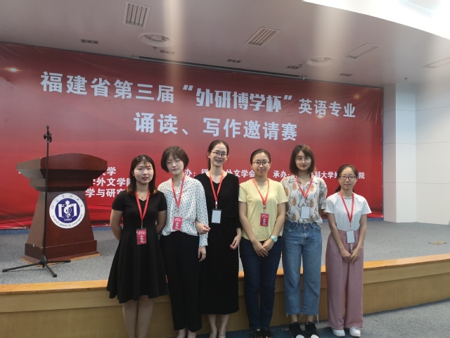 6月9日,福建省第三届“外研博学杯”英语专业诵读、写作邀请赛在福建医科大学外国语学院举行,此次赛事由福建医科大学、厦门大学外文学院和外语教学与研究出版社共同主办,福建省外文学会协办,福建医科大学外国语学院承办。经过激烈角逐,我院蔡汶君同学在诵读邀请赛中获得二等奖,王丝莹、李磊同学获优秀奖;在写作邀请赛中,林莉莉、朱碧晖同学获一等奖,李宇晞同学获优秀奖。