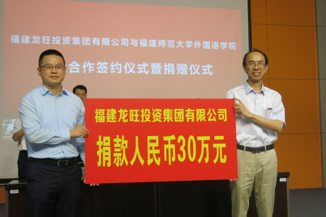 龙旺集团副总裁郑铨凯在致辞中表示,龙旺集团与福建师范大学的深情厚谊由来已久,自“福师龙泽文旅产业投资集团”战略合作达成之后,双方的合作日渐深入。此次与外语学院签订校企合作协议,相信对双方都将具有深远的意义,有利于双方进一步整合优质资源,深化产学研融合。在这次的签约仪式上,龙旺集团将捐赠30万元善款用于改善外语学院的教育基础设施建设,为外语学院师生营造更美好的工作学习环境。