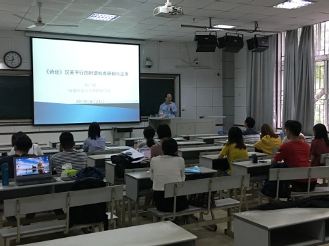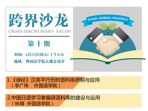 2019年6月23(周日)上午8点30分,第十期跨界沙龙于福建师范大学外国语学院100教室举行。本次沙龙的主题为方法论——语料库专题研究分享会,共有2位发言人。外国语学院的李广伟博士发言的题目是《<诗经>汉英平行历时语料库研制与应用》,林璋教授发言的题目是《中国日语学习者偏误语料库的建设与运用》。