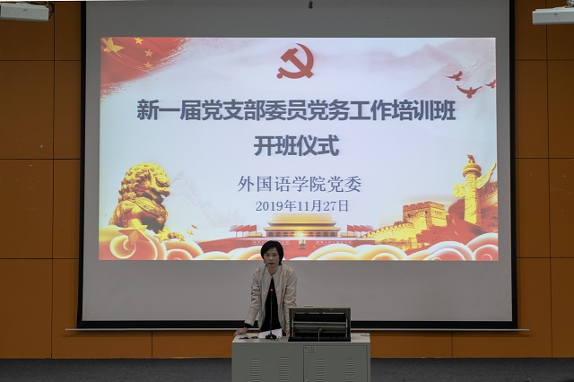 2019年11月27日下午,外国语学院新一届党支部委员党务工作培训班在外语楼多功能厅隆重举行开班仪式,学院党委委员、全体党支部委员参加了仪式。开班仪式由学院组织员王文协老师主持。