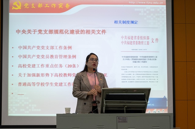开班仪式后,校党委组织部党建办公室主任钟蕊博士受邀讲授第一专题“新时代党支部工作的规范和创新”。她结合上级党组织有关精神和学校工作实际,用图片、案例讲述党支部日常工作规范,介绍了党支部立项活动和主题党日活动工作创新,提升党支部凝聚力、战斗力。最后以“五心”鼓励大家共同创建“五星”党支部。