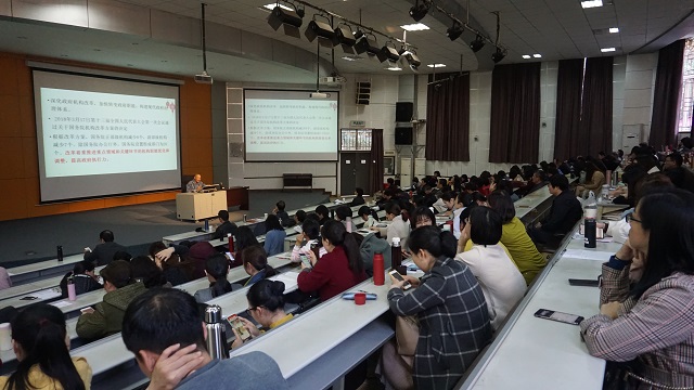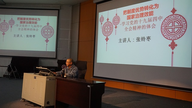 为深入学习贯彻落实党的十九届四中全会精神,根据学校安排,外国语学院于2019年12月11日下午邀请校党委讲师团成员、公共管理学院张铃枣教授为我院师生作题为“把制度优势转化为国家治理效能----学习党的十九届四中全会精神体会”专题讲座。学院全体教职工及新一届党支部支委参加了此次讲座。院党委章琳书记主持本次专题讲座。