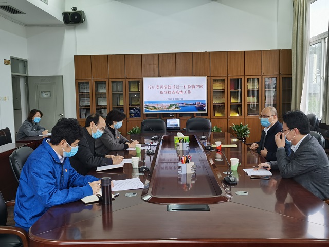 2月27日下午,校纪委黄清波书记、校纪委综合室董青松主任,到我院指导检查新冠肺炎疫情防控工作,学院党委书记章琳、主持工作副院长葛桂录,副书记李启辉等同志出席会议。