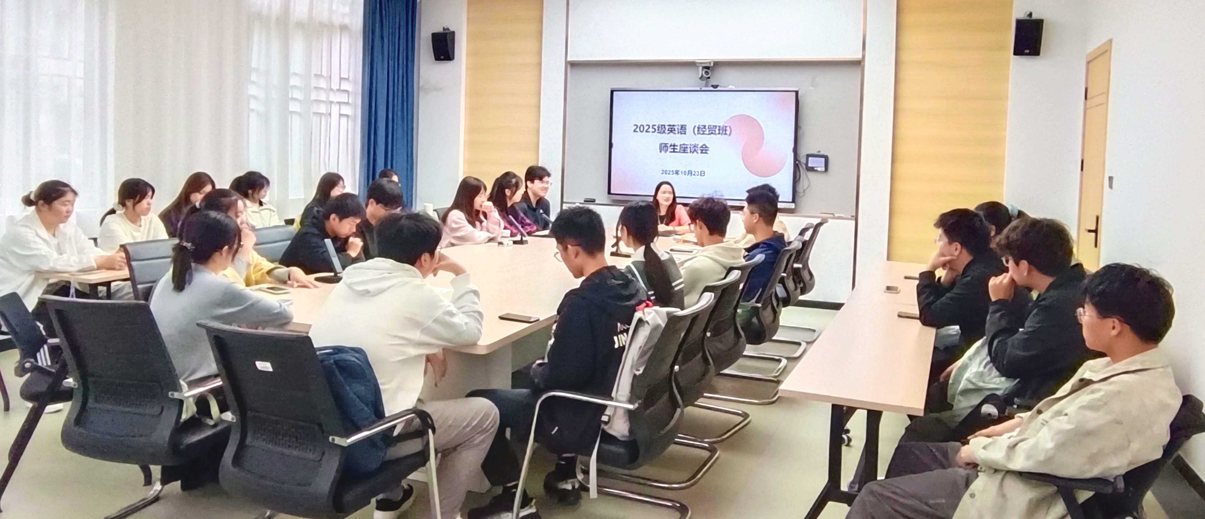 为帮助新生更好地融入大学生活、了解专业特色与成长路径,外国语学院商务英语系于2025年10月23日上午召开2025级新生座谈会。会议由商务英语系副主任梁素丽老师主持,系主任刘茵老师、班主任廖国海老师,以及2025级新生和2022级、2023级优秀学生代表共同参加本次座谈会。
