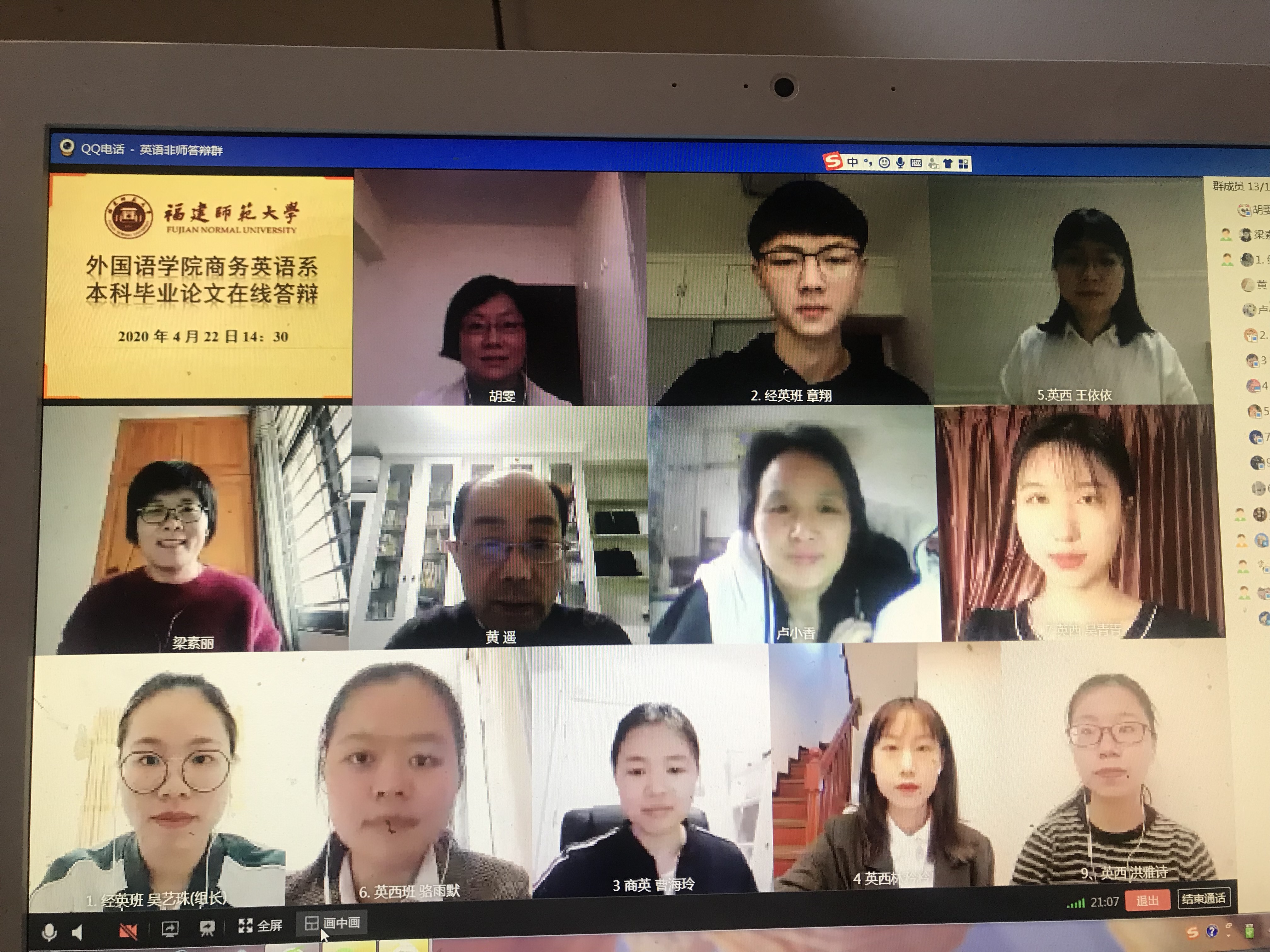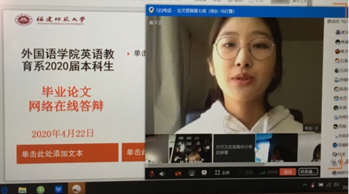 2020年4月22日下午,外国语学院通过QQ平台进行屏幕共享与视频通话的方式,组织开展了2020届本科毕业论文线上答辩会。共计14个答辩小组,56名教师、176名应届本科毕业生参加了此次答辩会。