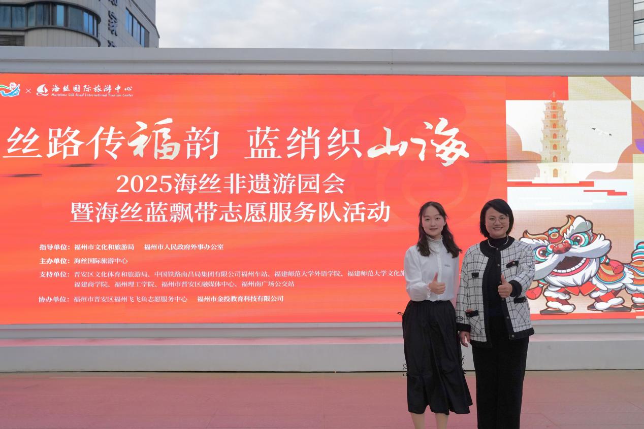 12月5日,时值第 40个 “国际志愿者日”,由福州市文化和旅游局、福州市人民政府外事办公室指导,海丝国际旅游中心主办的“丝路传福韵 蓝绡织山海”2025海丝非遗游园会暨海丝蓝飘带志愿服务队活动在海丝国际旅游中心圆满落幕。我院吴华荔老师受邀带领2024级英语(师范)专业魏琳嘉同学参加了本次活动。