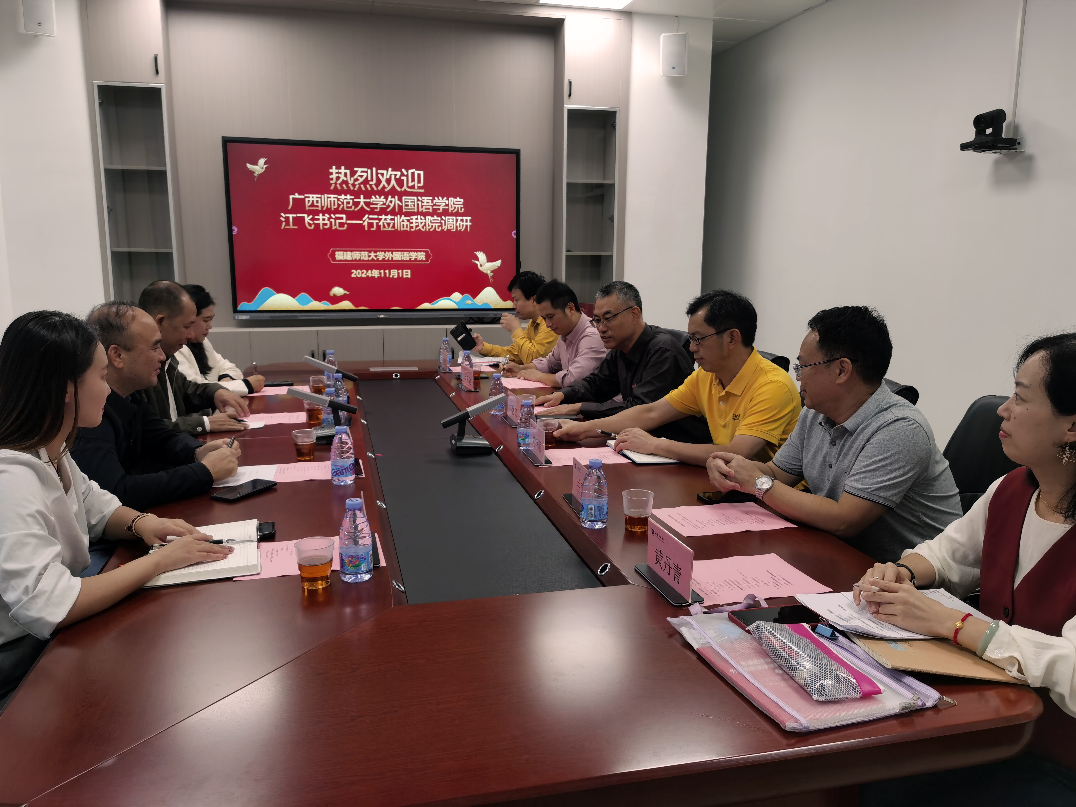 11月1日下午,广西师范大学外国语学院党委书记江飞同志、副院长刘明录教授等一行4人到我院进行调研。双方就学院党建工作,学科建设与科研工作,本科专业课程体系、课程设置及特色,学风建设及辅导员队伍建设等方面进行深入交流。双方均表示,作为地方高师院校,在专业建设和人才培养等方面存在诸多相同点,也面临相同挑战,今后双方要加强交流,在服务国家基础教育等方面彰显更大担当作为。