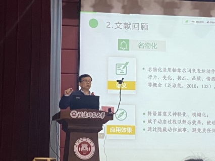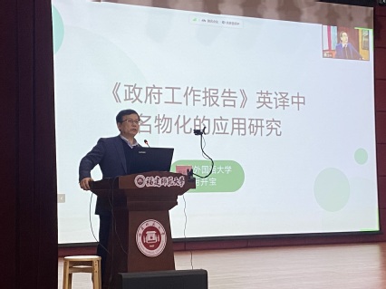 讲座伊始,胡教授开门见山指出《政府工作报告》在推动中外政府交流之间起到了重要作用,《报告》英译本的名物化现象需要重点关注。胡教授从概念、类型、功能等方面对名物化进行了解释,以语料库翻译学和批评翻译学为观察视角,对比分析《政府工作报告》汉英平行语料库和美国《国情咨文》语料库中文本的名物化现象,总结出两者在名物化使用方面的异同点,提出《报告》英译文名物化使用有增加信息密度、模糊施事者、预设背景、提高话语专业化程度和衔接语篇等功能;名物化使用频率比《国情咨文》高主要在于两者的语域特征差异、英汉语言使用差异及机构翻译制约等。
