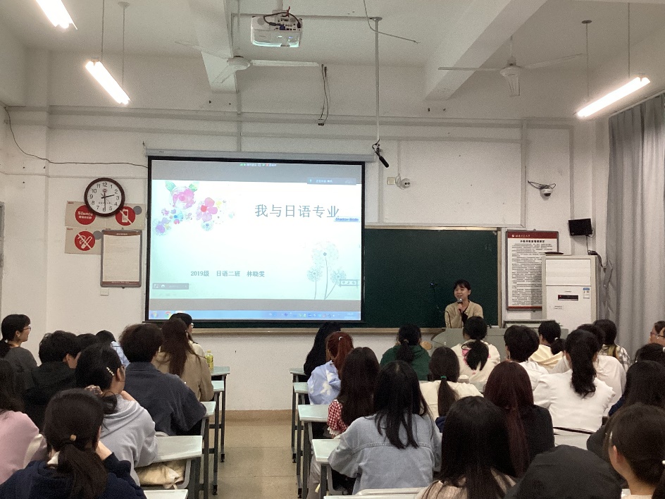其次,林晓雯同学和王威同学以自身的经验之谈为学弟学妹们“传经授道”。林晓雯同学展示了一系列照片,分享了自己大学期间的留学体验、学习方法、心得体会等。王威同学则以幽默风趣的口吻,讲述了自己在日语学习方面的收获和感想。