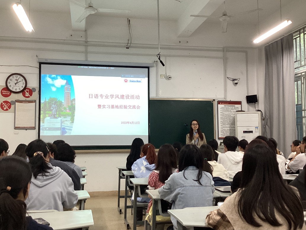 4月13日下午,我院日语系在外语楼教室215召开“2023年日语专业学风建设活动暨实习基地经验交流会”。交流会邀请我院19级林晓雯同学、法政大学硕士研究生王威同学以及百译堂翻译服务有限公司总经理潘郁灵女士为主讲嘉宾,为日语专业学生分享经验、答疑解惑。会议由日语系副主任蔡妍老师主持,日语系主任黄毅燕老师、副主任陈燕青老师、22级辅导员刘常兰老师以及21级、22级日语专业全体学生出席了交流会。