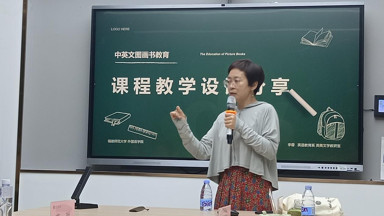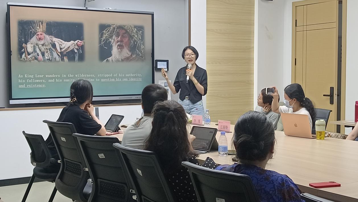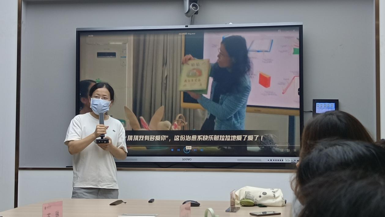 活动在学习习近平主持二十届中共中央政治局第五次集体学习并发表重要讲话中拉开帷幕。在课程思政示范环节,联合授课的李蓉和江丽锋两位老师分别从理论和实践方面介绍了“中英文图画书教育"课。江丽锋老师首先结合本学期授课视频,详细介绍了该课程如何将英语与绘画、戏剧、诗歌等艺术进行融合,将“爱”“尊重”“中国传统文化”“世界文明”等思政主题贯穿于教学始终;李蓉老师接着从课程目标、教学内容、教学设计、教学评价等方面分享了这门课程的创新设计理念,对标师范专业认证标准和中国学生发展核心素养,探索英语师范生培养的新路径。 两位老师极富热情又不失幽默的分享赢得阵阵掌声和笑声。