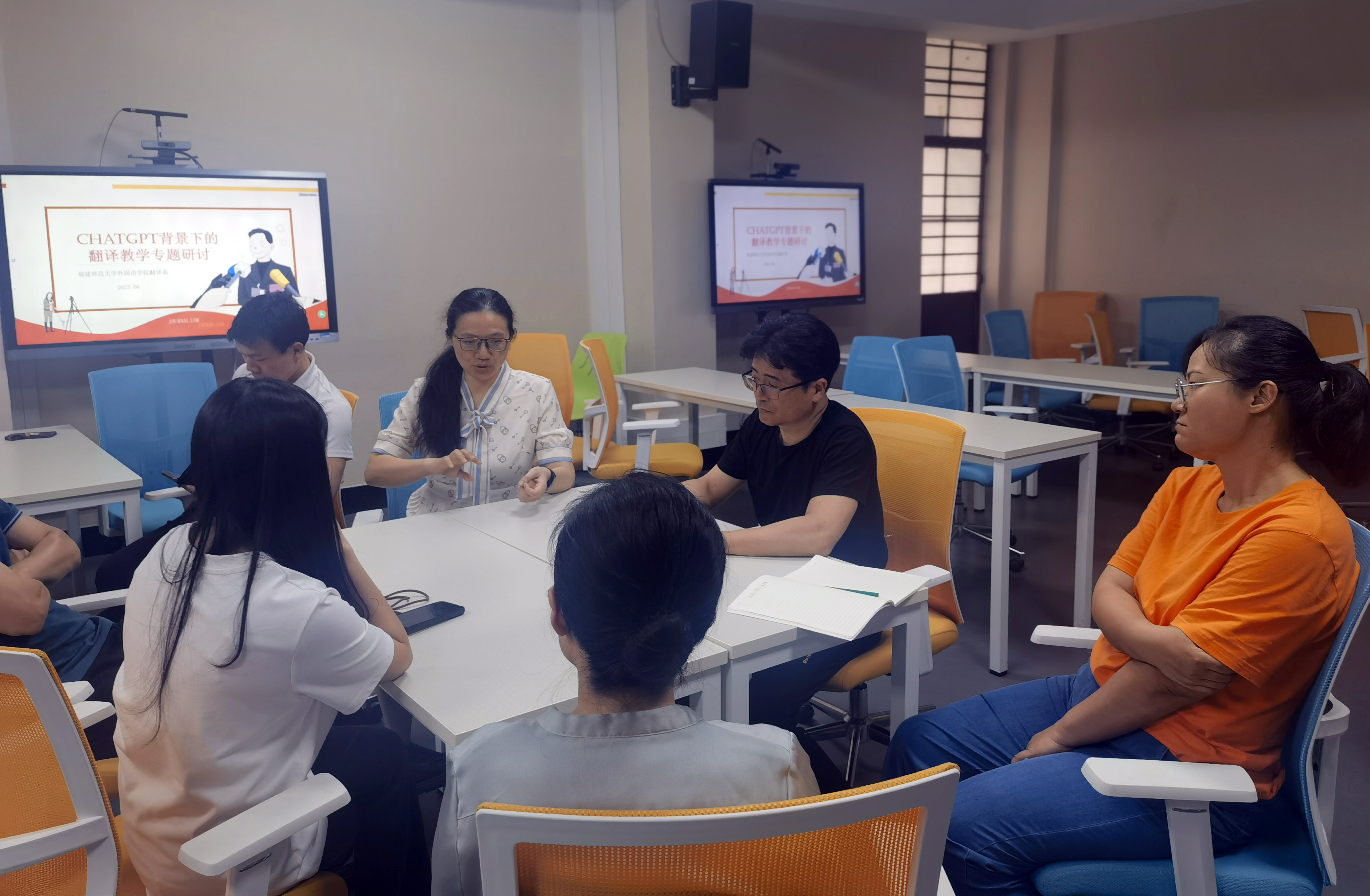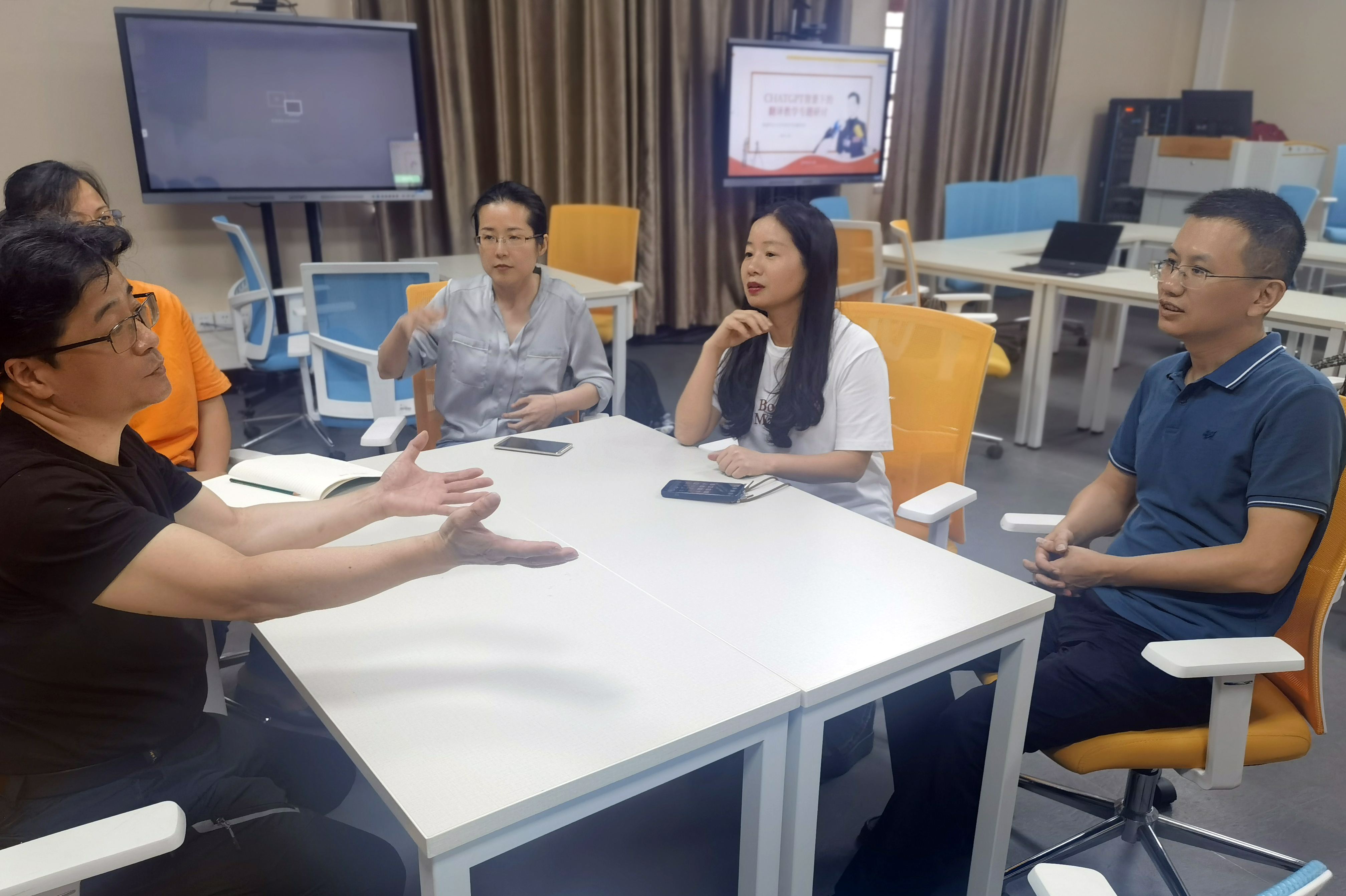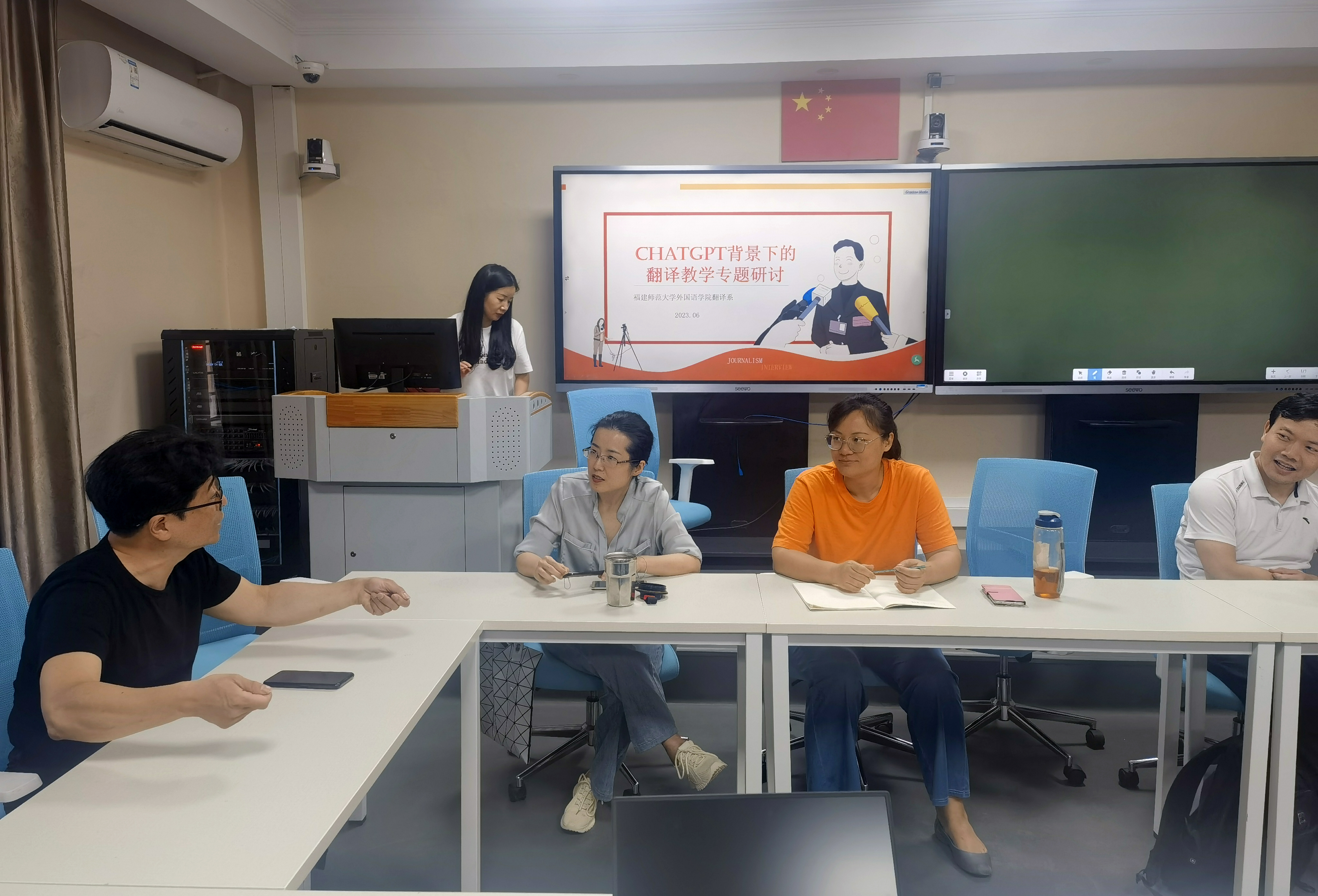 第二阶段,大家观摩了岳峰教授的《新闻翻译》教学片段,展开了翻译课堂与翻译实践的结合教研,其中岳峰教授强调了新闻翻译中“编译”在翻译中的重要性,这也正是 ChatGPT 无法胜任的工作。于是,老师们临时发起了“ChatGPT背景下的翻译教学专题研讨活动”,交流了各自的“ChatGPT翻译初体验”以及对人工智能用于翻译实践与教学的不同看法活。至此,活动进入了第三阶段,大家一致认为,人工智能将为翻译提供巨大的助力,可以大大提高翻译生产效率和改善译文质量,但仍无法代替高端翻译业务。翻译专业的课程也应积极拥抱人工智能,以提升教学效果及培养更高水平的翻译人才。