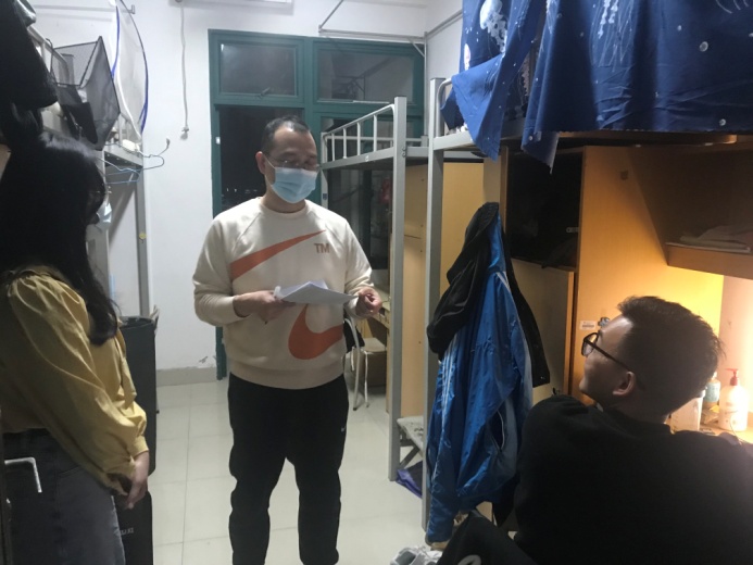 为全面掌握学生在校住宿生活情况,扎实落实疫情防控各项举措,3月31日晚,外国语学院辅导员在学院党委副书记吴志锋的指导下,各年级辅导员带队深入各宿舍开展突击检查工作。