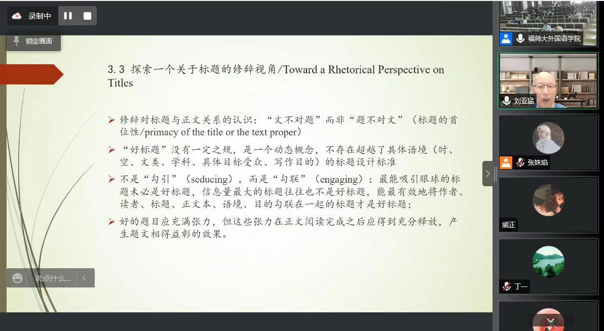 4月26日上午,我院刘亚猛教授应邀为学院师生作了题为《“袖里乾坤大”——标题的修辞意涵刍议》在线学术讲座。本次讲座由外国语学院修辞与论辩研究中心“藤山修辞学讲堂”主办,学院院务委员、博士生导师尤泽顺教授主持了讲座。来自外国语学院及省内外高校的师生200多人现场或线上聆听了讲座。