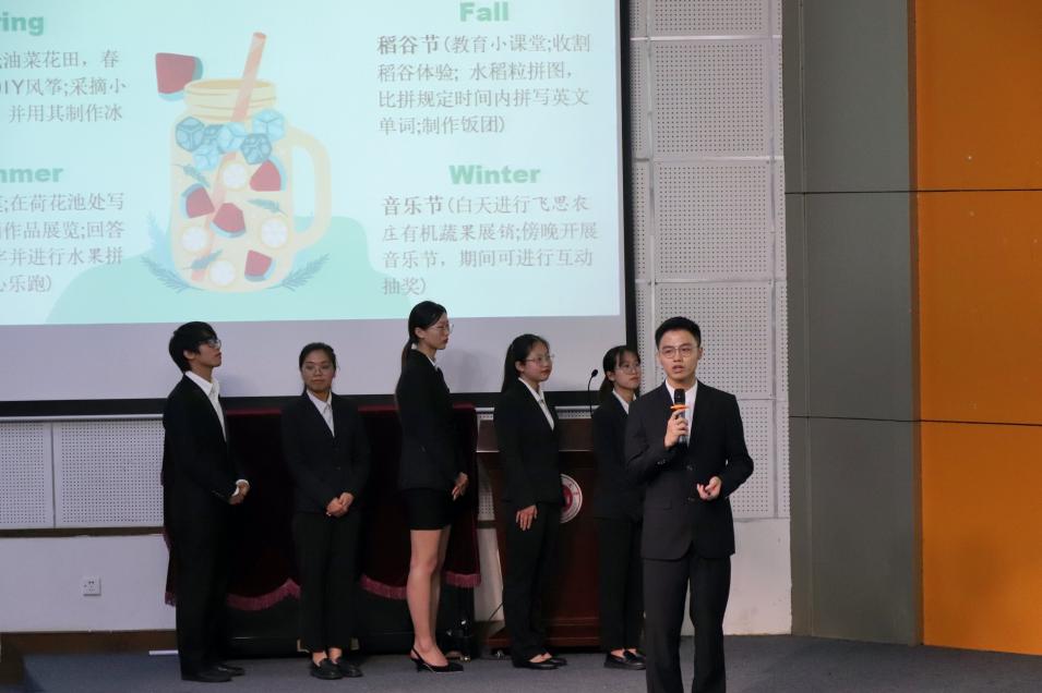 本次营销策划大赛决赛共分为项目路演和现场答辩两个环节。在路演展示环节,8组参赛队伍密切配合,从飞思农庄独特的自然资源、市场定位、企业文化、经营理念出发,立足于双语教育、共享经济、劳动教育、自然教育,生动形象地展示了各具特色的营销策划方案。在答辩环节,评委们围绕各个队伍的方案独特性、策划可行性、项目可持续性等方面进行提问,各参赛团队以条理清晰的陈述、沉着冷静的应答、积极大方的表现充分展现了自身不俗的专业素养,得到了评委专家的一致认可和称赞,赢得了大众评委的阵阵掌声和踊跃举牌。