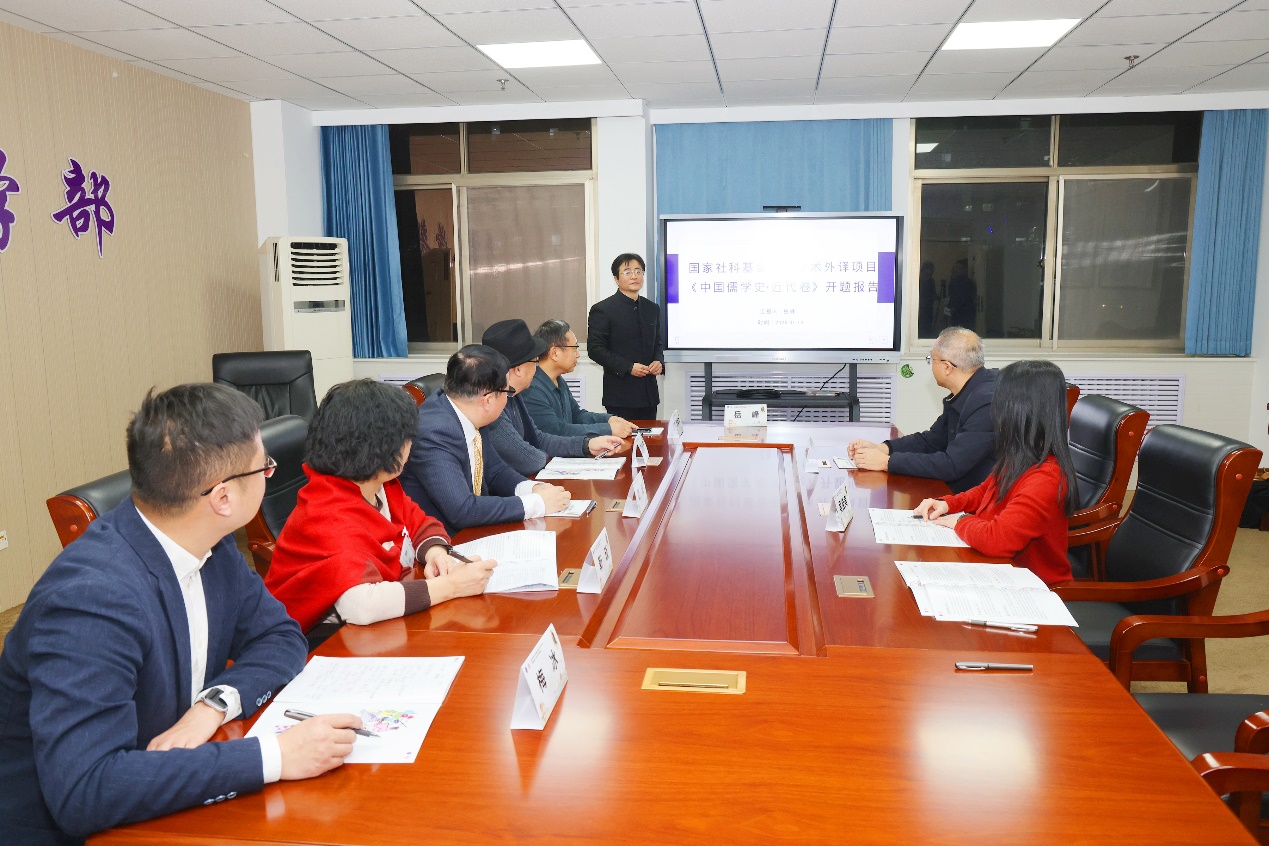 2026年1月9日至12日,中华学术外译项目《中国儒学史》(九卷本,北京大学出版社)开题会在河北石家庄河北医科大学举行。我校岳峰教授主持的《中国儒学史》(近代卷)成功完成开题。开题会由北京大学出版社主办,河北医科大学承办。北京大学出版社领导、翻译专家、儒学专家参加了会议。北京大学出版社社长马建钧强调,学术外译是推动中国学术“走出去”的关键之举。丛书总主编、著名儒学专家北京大学张学智教授对翻译工作提出“坚守学术本真、传达思想神韵、契合国际表达”的总体要求。北京大学出版社海外合作部主任王妍对项目管理提出具体要求。由武波教授、吴松林教授等组成的专家组听取了各翻译团队的汇报并提出了指导意见。