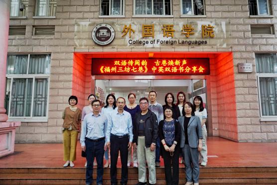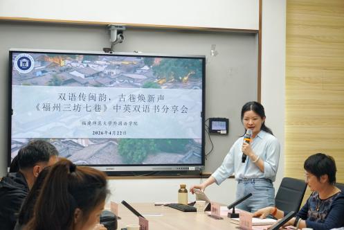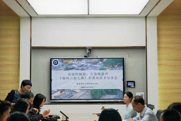2026年4月22日下午,《福州三坊七巷》中英双语书编委会于福建师范大学外国语学院陈明金教学楼隆重召开新书分享会。该书系“福建历史文化丛书•中英双语系列”的重要组成部分,亦是翻译与国际传播研究团队与区域国别研究团队的另一大力作。本次活动以“双语传闽韵,古巷焕新声”为主题,特邀参与书稿审稿的历史文献专家戴显群教授、为本书编纂提供坚实史料支撑的福州名城保护有限公司副总经理白宝霞,品宣部经理陈锦芳以及文旅部经理黄秋淋以及全体编写团队成员出席分享会。大家齐聚一堂,共同回顾编纂历程、交流心得体会,活动由翻译系主任助理黄越悦老师主持。。